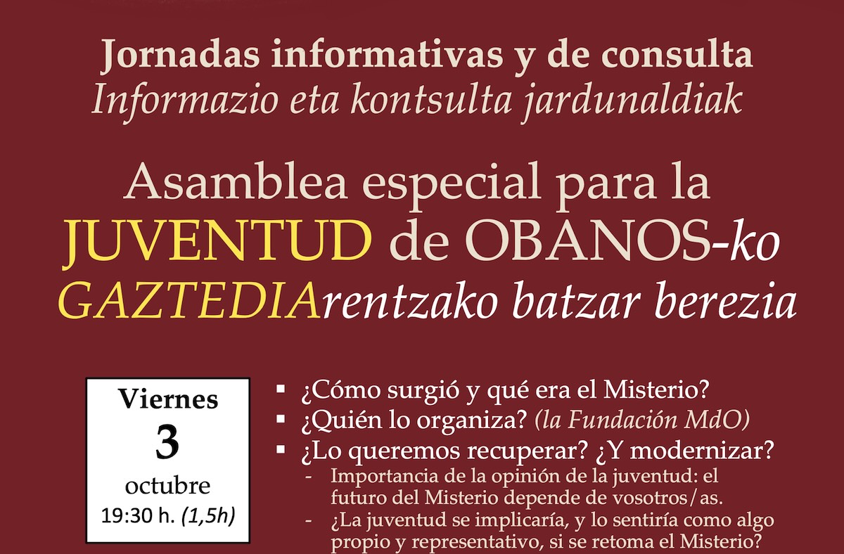 El próximo viernes 3 de octubre, se celebrará una asamblea sobre el Misterio de Obanos que está dirigida especialmente a la juventud. La cita ha sido convocada por el presidente de la Fundación Misterio de Obanos, Mikel Pagola Erviti, dentro de la serie de jornadas informativas y de consulta al pueblo, según la intención aprobada por el Patronato de la Fundación Misterio de Obanos en su junta del 21 de noviembre de 2024, y ratificada posteriormente en la sesión del pasado 23 de septiembre de 2025.