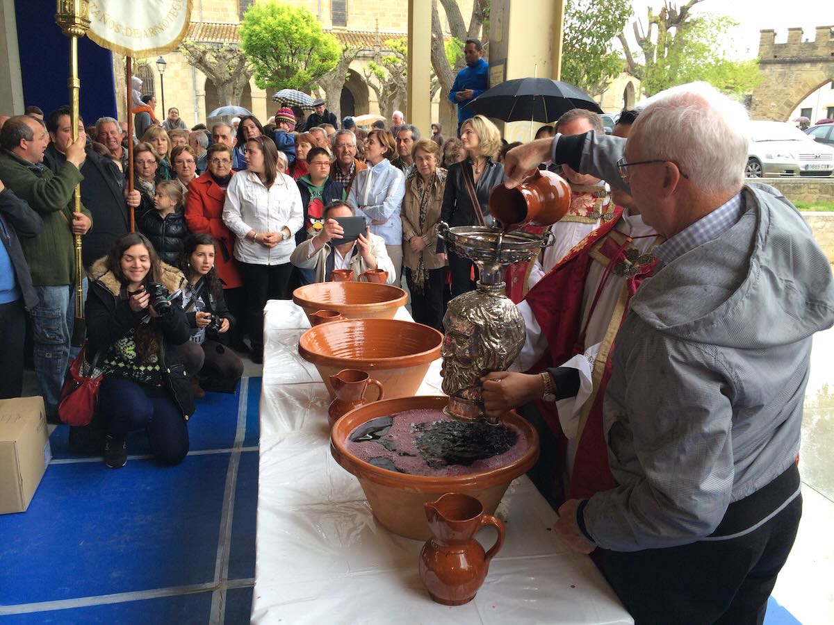 - Se pasa agua y vino (clarete y tinto) por la cabeza de San Guillermo, en ese orden, para que caigan en sendas tinajas de barro diferentes, juntándose con el resto de iguales líquidos, considerándose tradicionalmente que así queda bendecido todo el contenido de cada tinaja. Los vinos y el agua se dan a beber a los asistentes, sirviéndose con jarras de barro. Después se reparten pastas, por invitación de la Asociación de Cazadores San Guillermo.